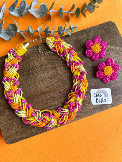 Luxe Flora Pink Yellow Handmade Beaded Bracelet + Ring Combo