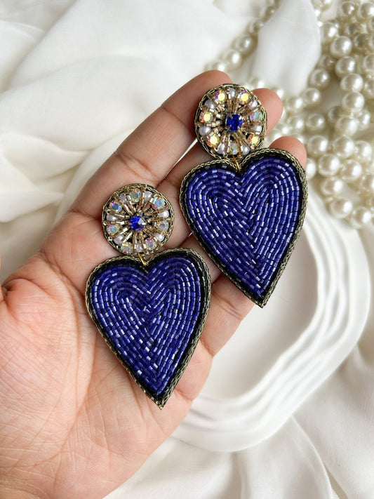 Glam Blue Heart Drop Handmade Beaded Earrings