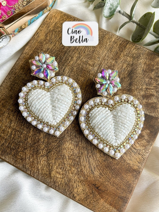 Ishqiya White Heart Drop Handmade Beaded Earrings