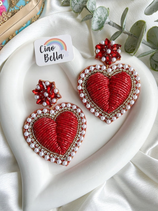 Ishqiya Red Heart Drop Handmade Beaded Earrings
