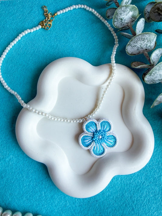 Aqua Blue Blossom Flower Handmade Beaded Necklace + Earrings Set