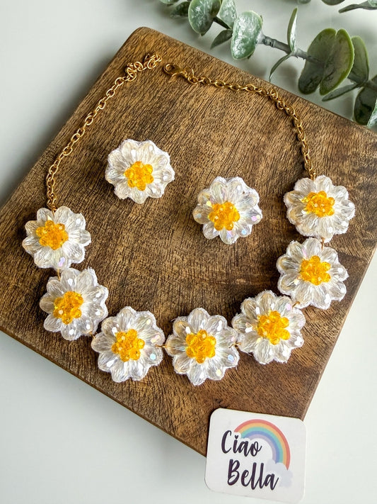 Sparkling White Daisy Handmade Beaded Necklace + Earrings Set