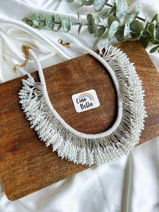 Luxe Flora Silver White Handmade Beaded Necklace + Earrings Set