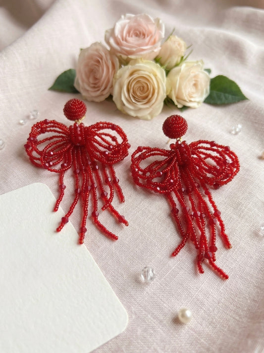 Pookie Bow (Deep Red) Handmade Beaded Earrings