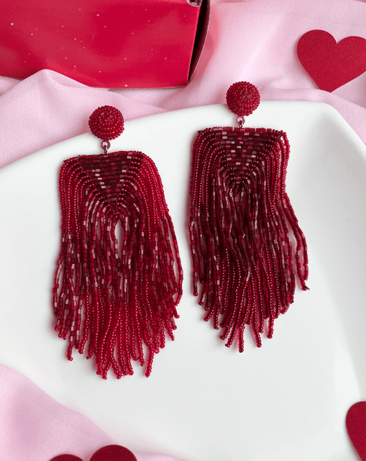 Luxe Deep Red Handmade Beaded Tassel Earrings