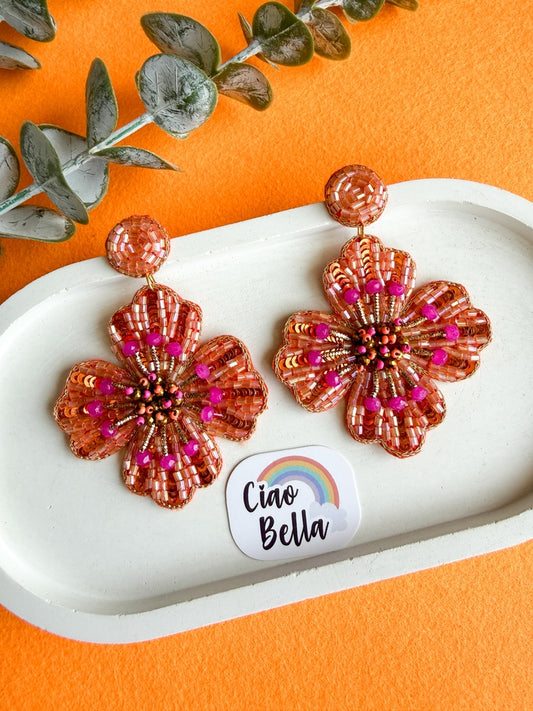 Sunset Orange Glow Flower Handmade Beaded Earrings