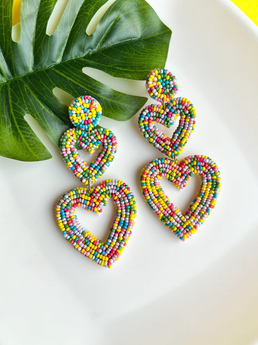 Rainbow Confetti Handmade Beaded Heart Shape Earrings