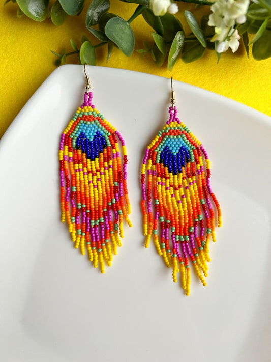 Pink Peacock Feather Handmade Beaded Tassel Bird Earrings