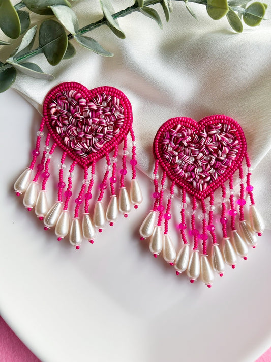 Hot Pink Heart Drop Handmade Beaded Tassel Earrings