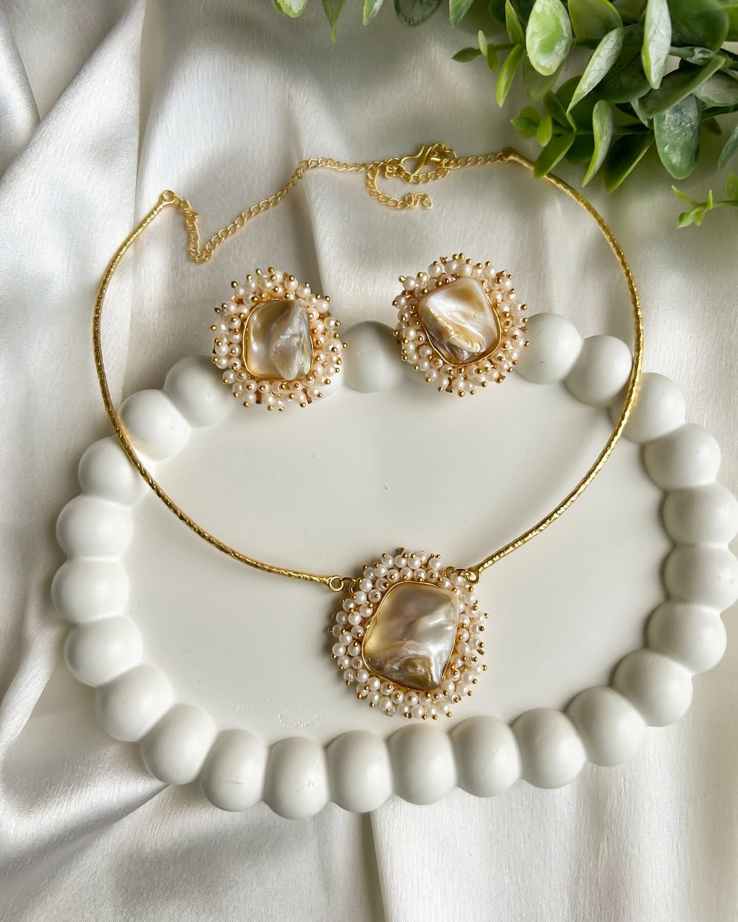 Please Note: This design features natural Mother of Pearl stones. Due to the organic nature of these stones, each piece is unique. Please expect variation in size, shape, colour in each stone.