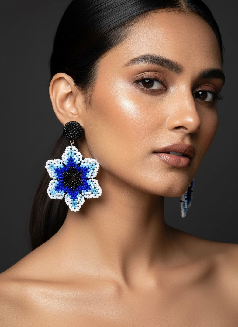 Add some color and fun to your wardrobe with our Blossoming Blue Flower Earrings! These unique earrings feature white, blue, and black beads arranged in a beautiful flower design. Perfect for adding a playful touch to any outfit.