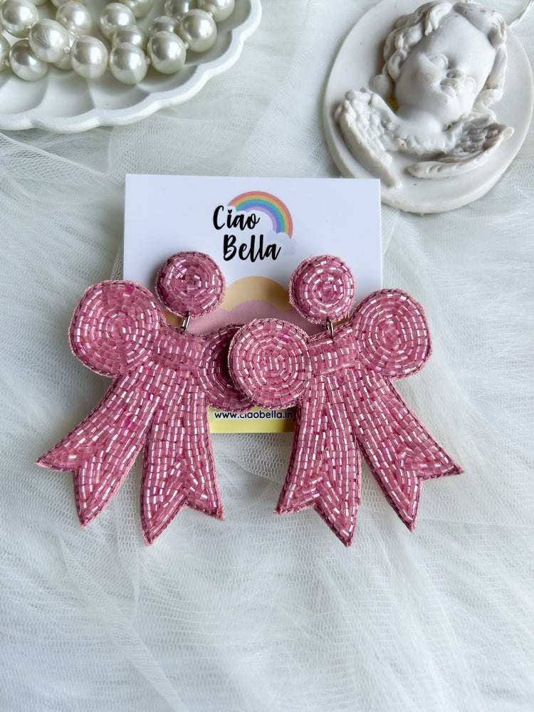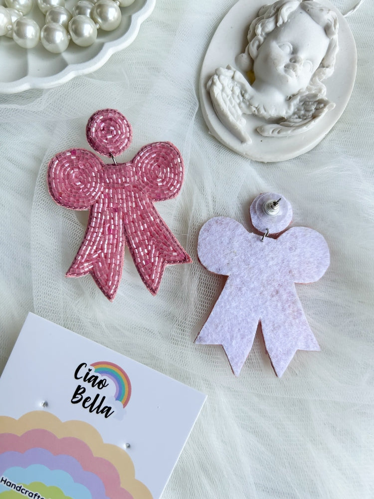 Add a touch of playful elegance to your outfit with these blush pink bow earrings. Handmade with delicate beads, these earrings are perfect for any occasion. Make a statement with these unique and quirky earrings.