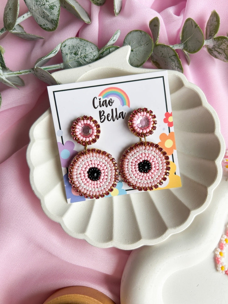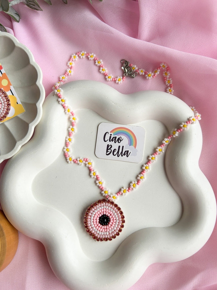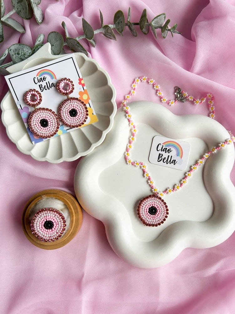 Blush Pink Evil Eye Handmade Beaded Jewellery Set featuring a matching necklace, earrings, and ring with striking pink evil eye motifs. Handcrafted with premium beads for a boho-chic look and symbolic protection. Perfect for everyday wear, festive occasions, or gifting, this set adds elegance and positivity to any outfit.