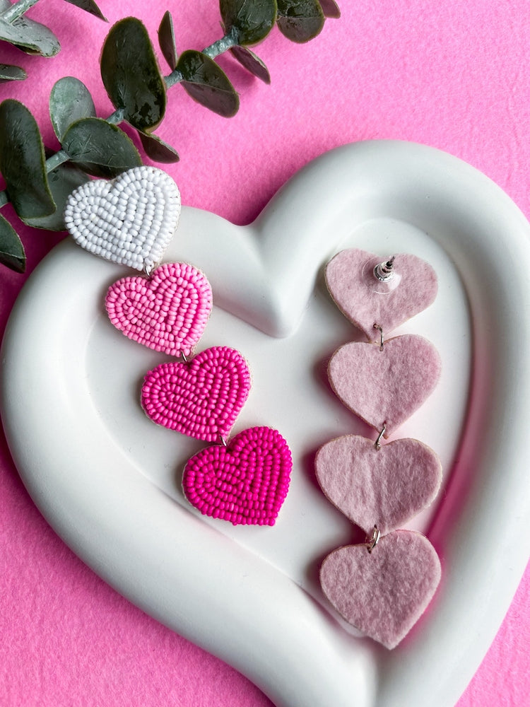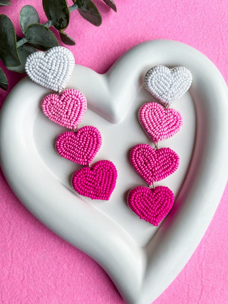 Embody your affection for fashion with these Blush Pink Love Drops Earrings! Delight in the 4 adorable hearts made with a combination of white and voluptuous pink beads. So stylish, you'll look drop dead gorgeous!