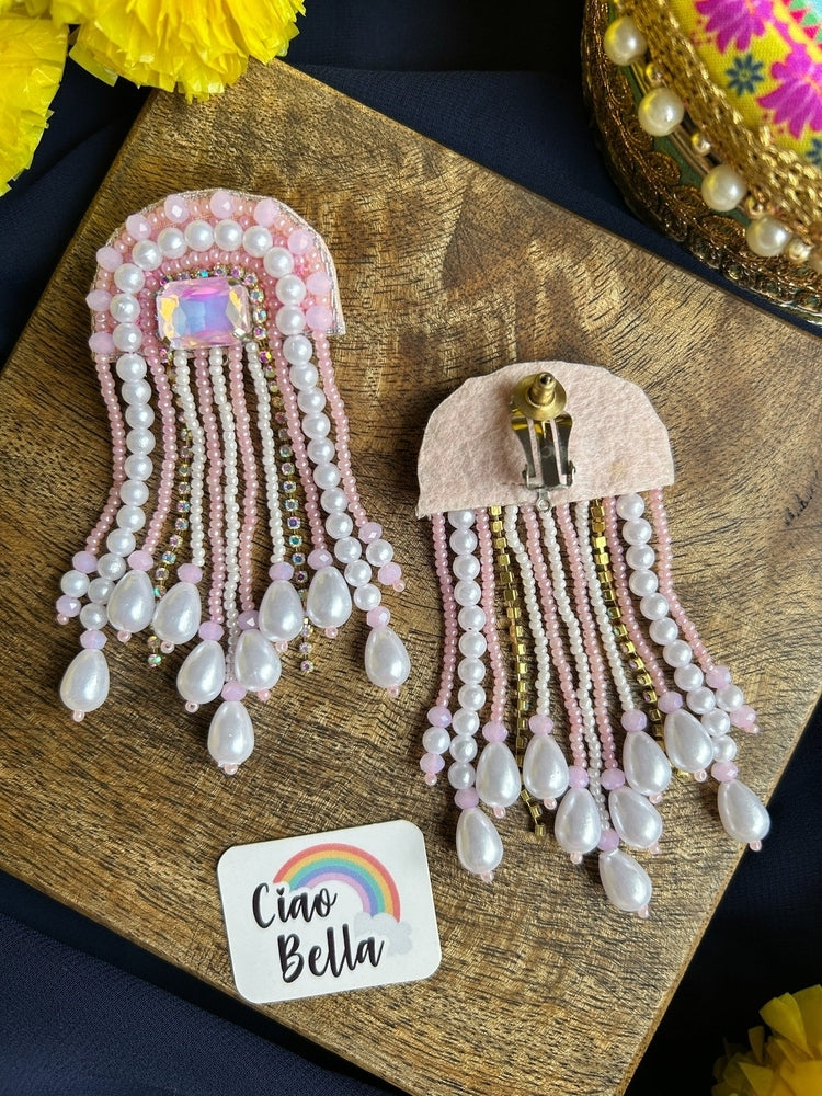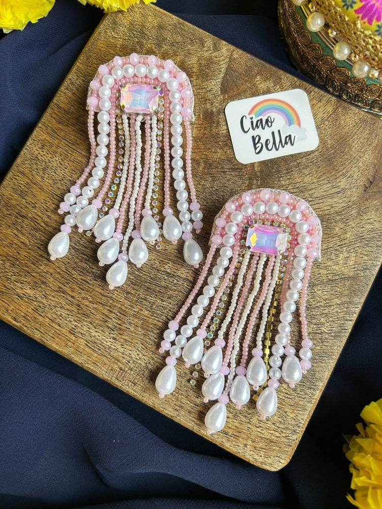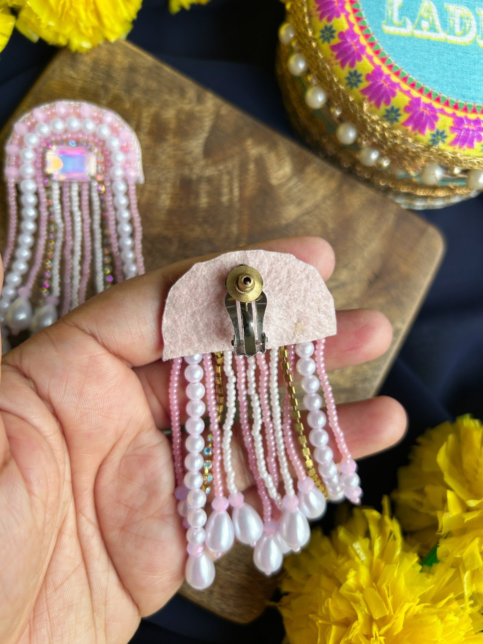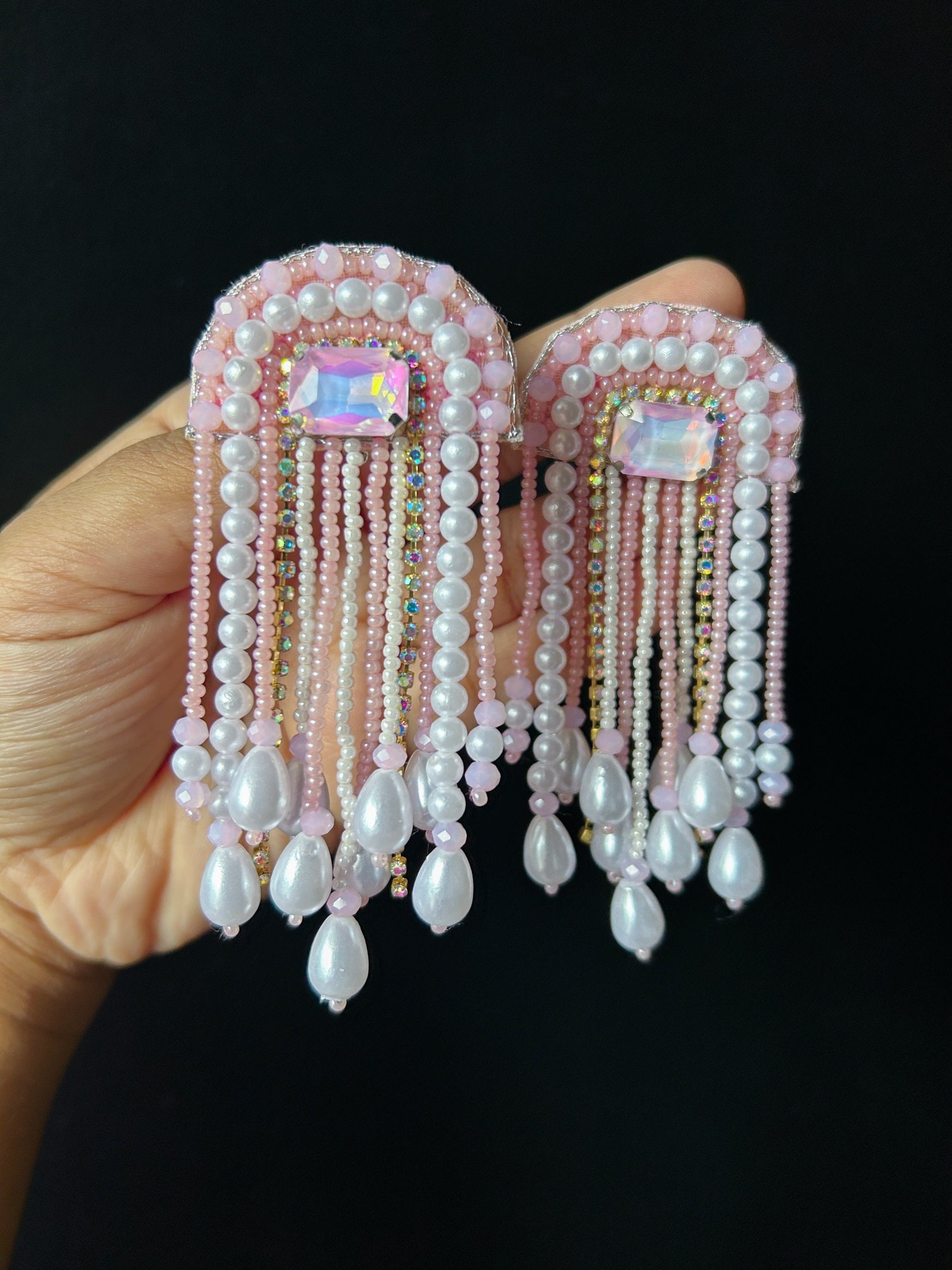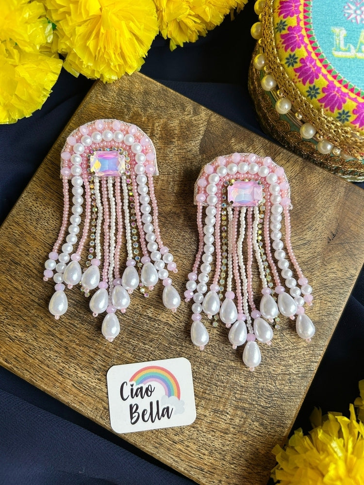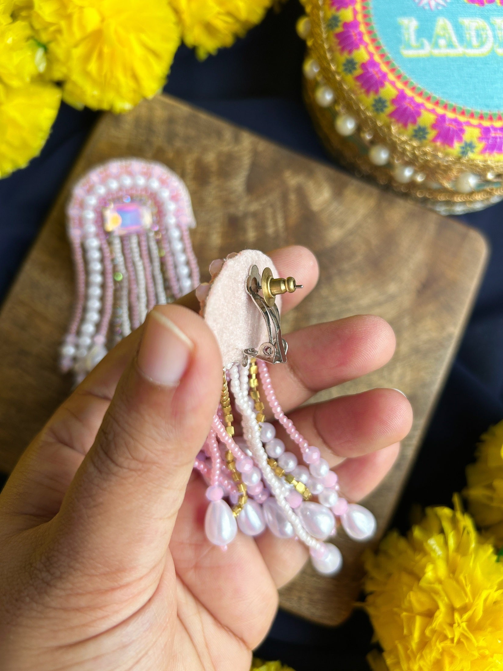 Intricately handcrafted with love, these light pink tassel earrings are made using premium quality beads and thread. Lightweight, elegant, and perfect for festive occasions or everyday glam, they add the perfect pop of color to your outfit. Inspired by moonlit charm, the Chandni Drops are where tradition meets trend.