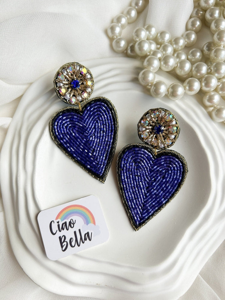 Glam Blue Heart Drop Handmade Beaded Earrings