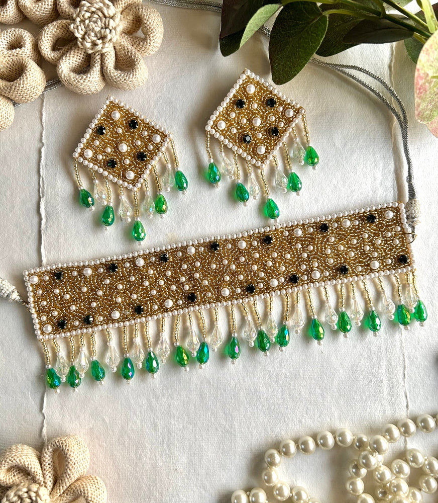 Flaunt your festive vibes in this elegant choker set that features golden beads and twinkling emerald glass stones. Add some extra sparkle to your style and shine in this perfect addition to your jewelry collection!