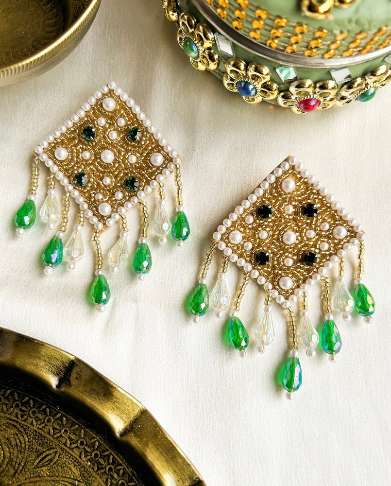 Dazzle your way through any festival with these Golden Emerald Glamour Earrings. Made for the glamour queen in mind, these elegant earrings are crafted with golden glass beads and dazzling emerald glass stones. Show off your style and shine!