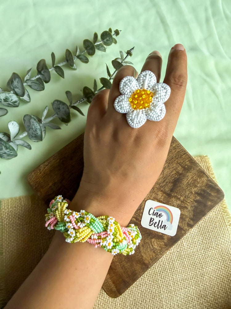 Luxe Flora Green Pink Yellow Handmade Beaded Bracelet + Ring Combo