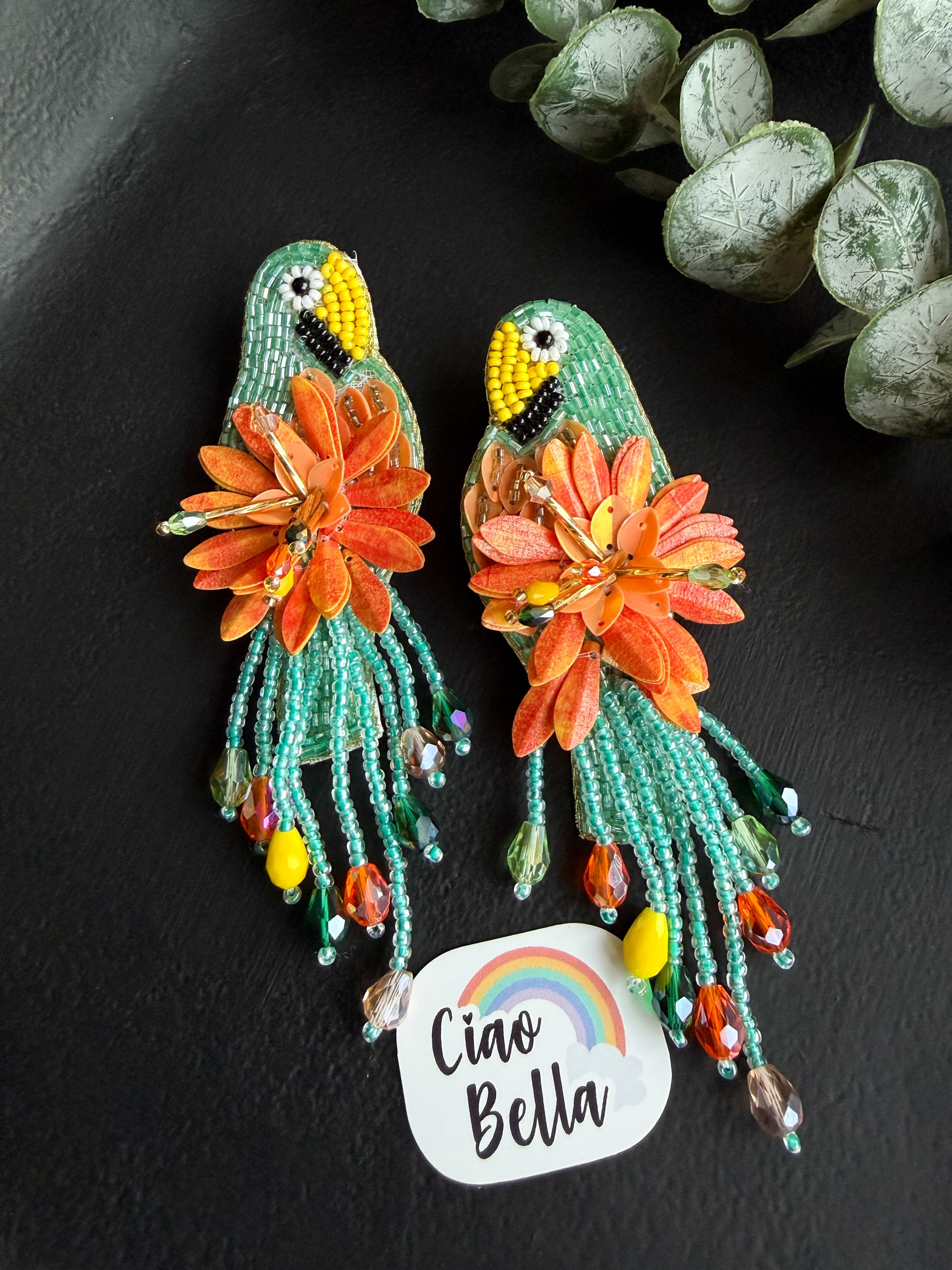 Luxe Paradise Mint Lagoon Orange Parrot Earrings Handmade Beaded Bird Earrings