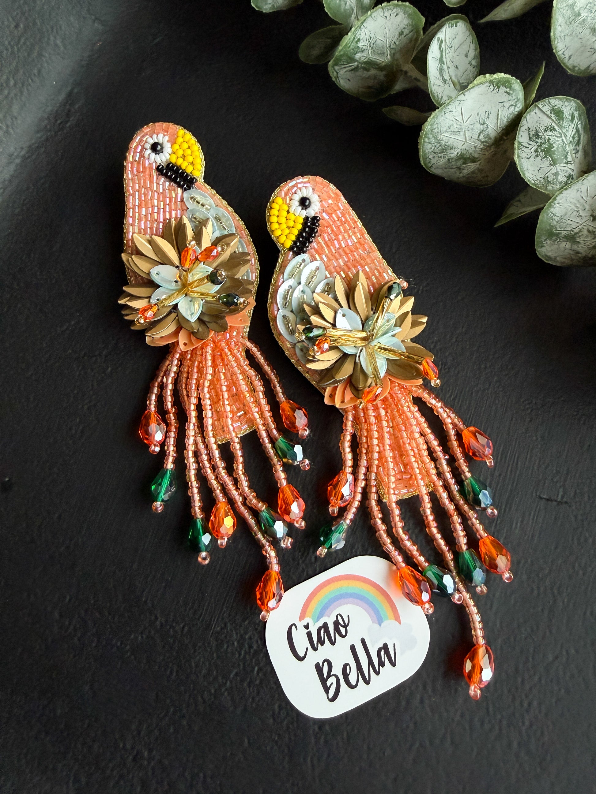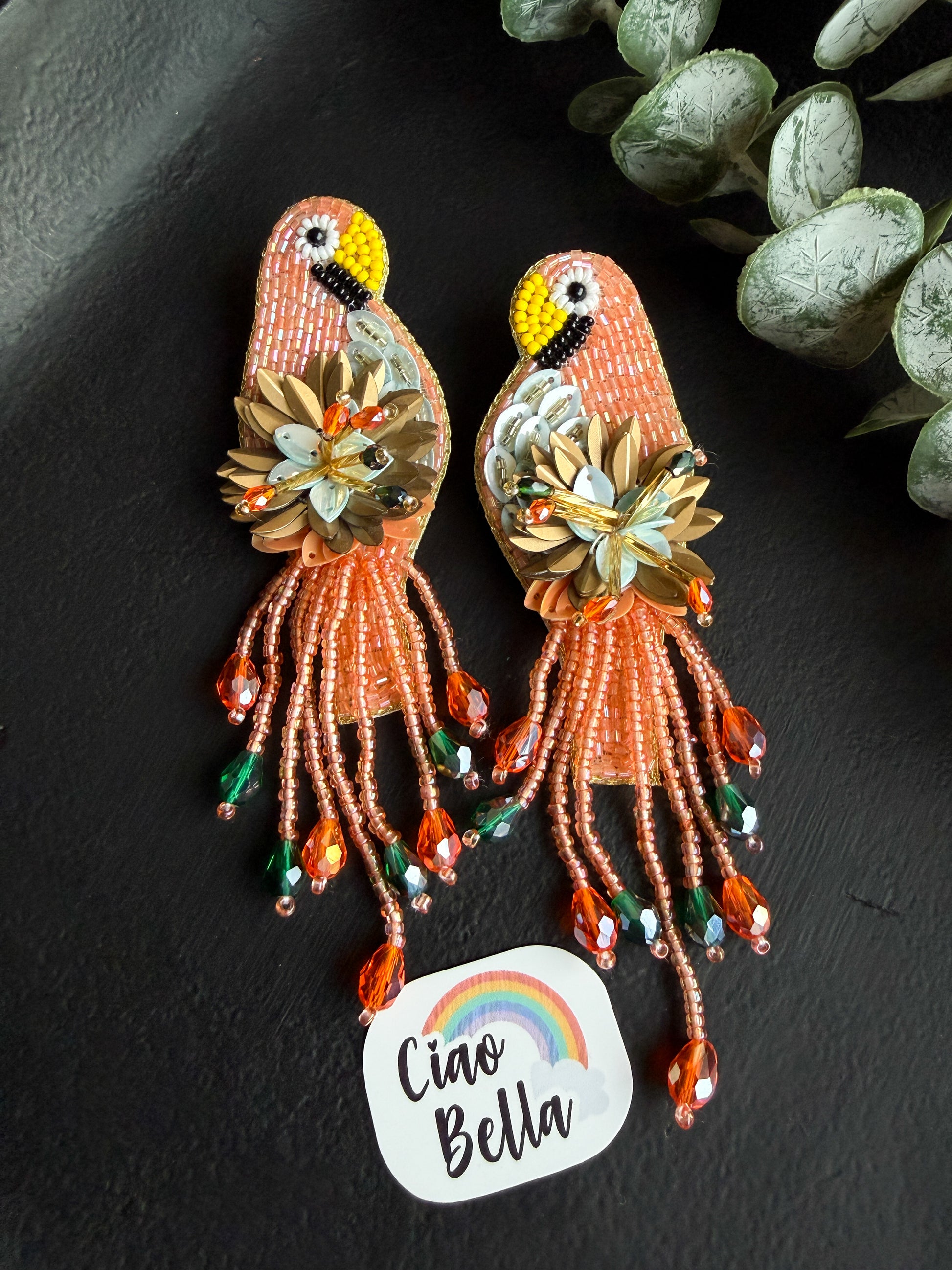 Luxe Paradise Peach Orange Parrot Earrings Handmade Beaded Bird Earrings