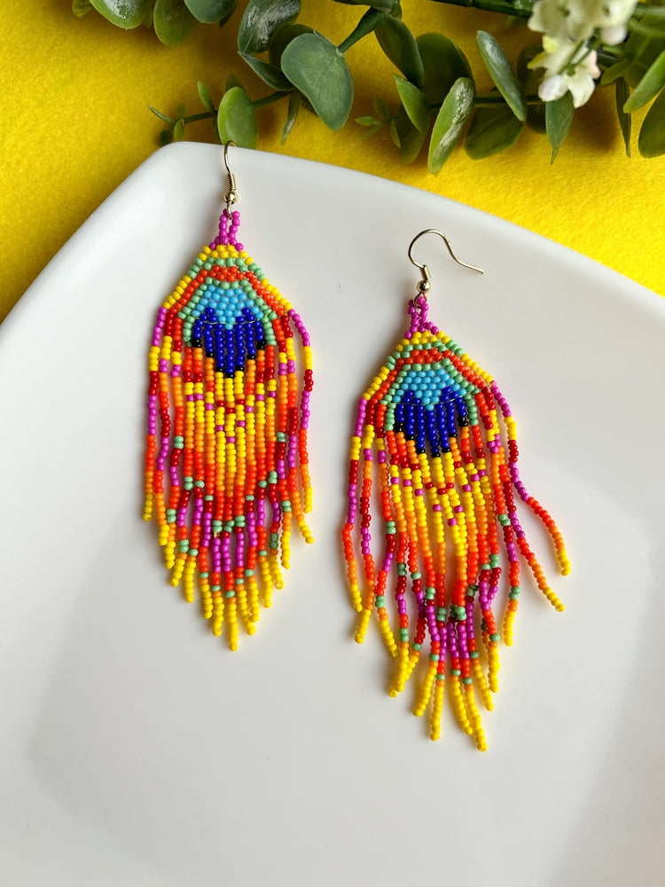 Pink Peacock Feather Handmade Beaded Tassel Bird Earrings