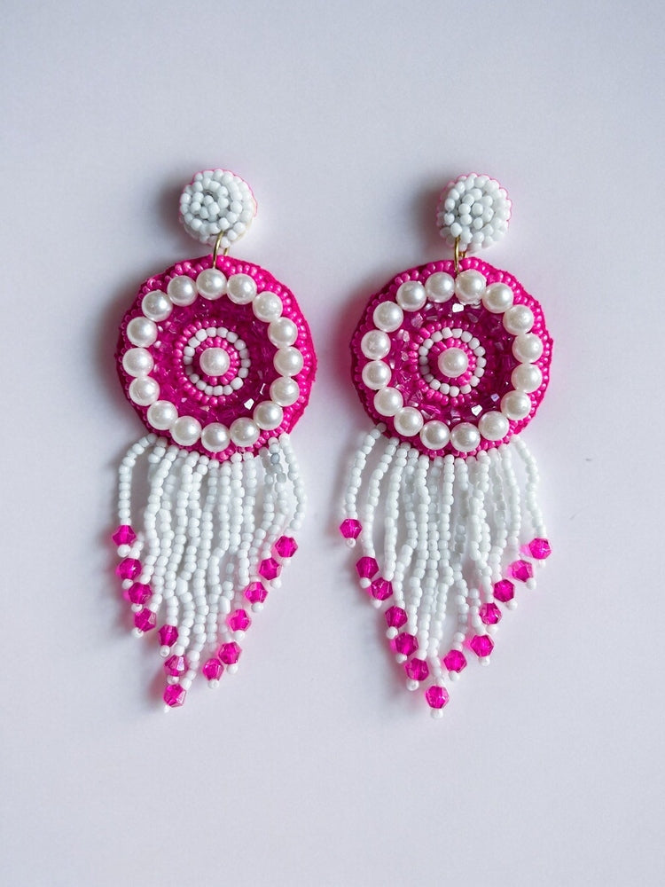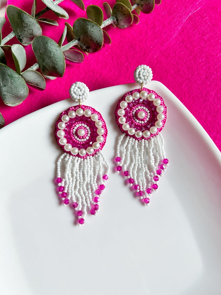 Treat yourself to these rosey tassel earrings - an irresistibly cheerful and oh-so-stylish way to brighten up your look! Made with magenta pink beads and pearls, these stunning festival earrings will put you in the spotlight. Ready, set, sparkle!