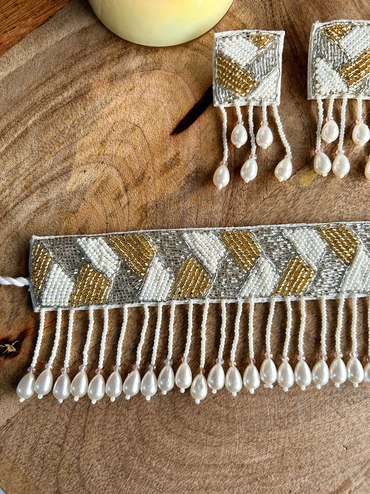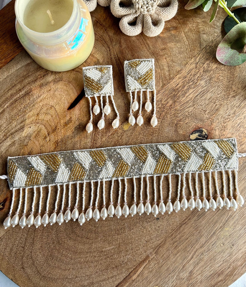 Welcome the festive season in style with this shimmering choker set! Featuring a white, gold & silver bead embroidery, this set adds some shimmer and sizzle to any outfit. Super chic and unique, you'll make heads turn all season!