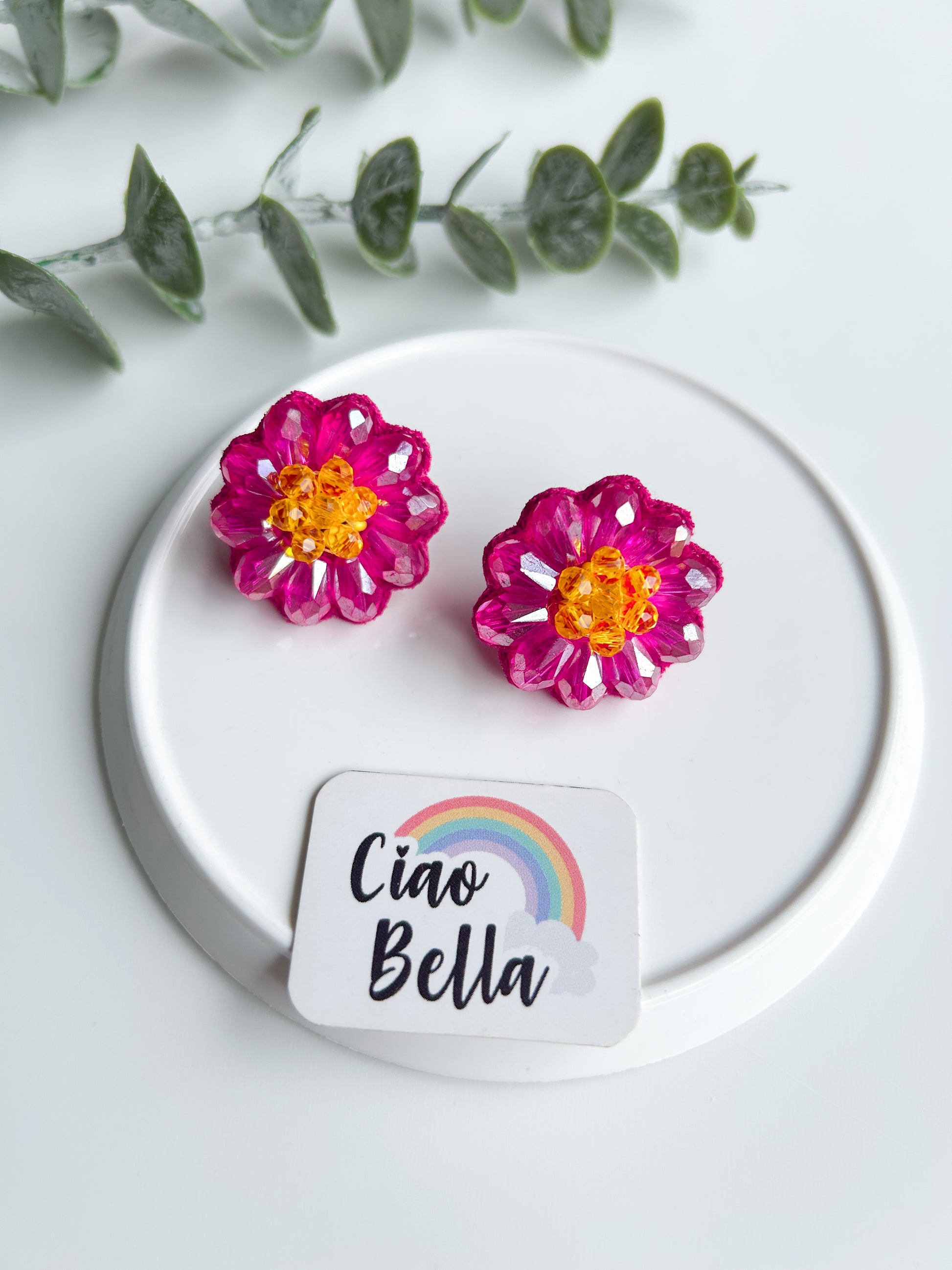 Sparkling Hot Pink Daisy Handmade Beaded Necklace + Earrings Set
