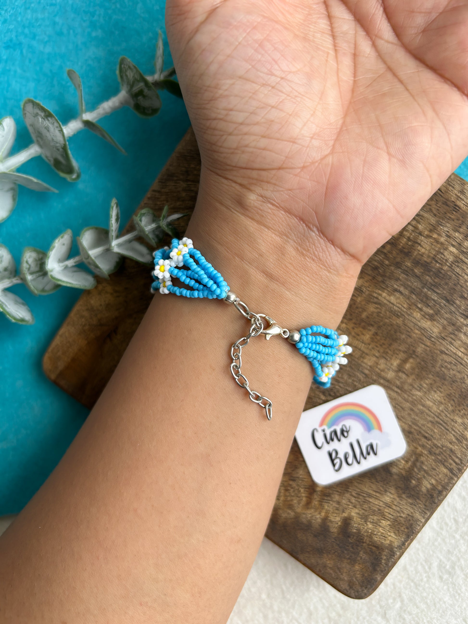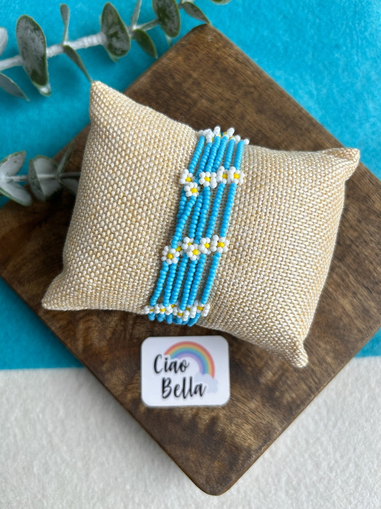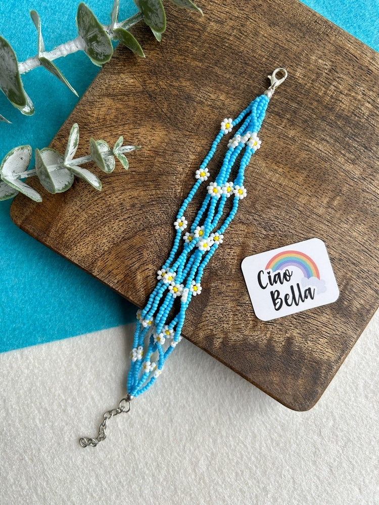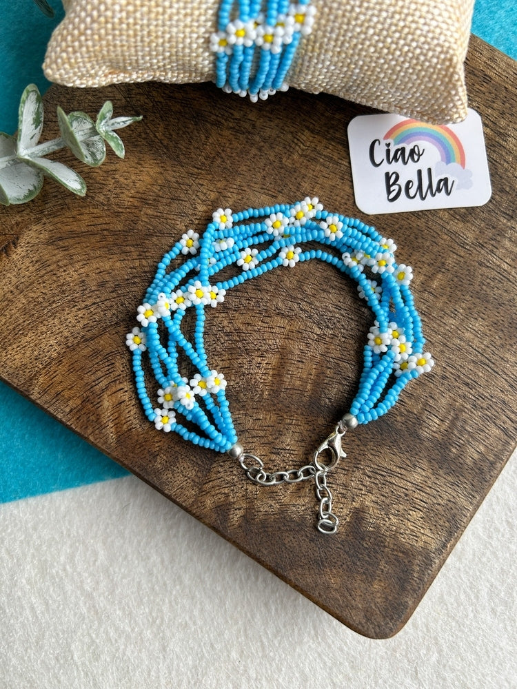 Spring Bloom Blue White Daisy Handmade Beaded Bracelet