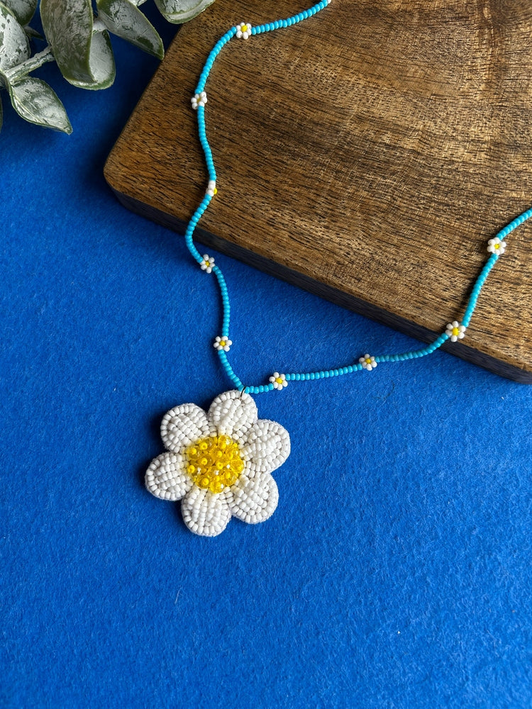 Spring Bloom Blue White Daisy Handmade Beaded Necklace