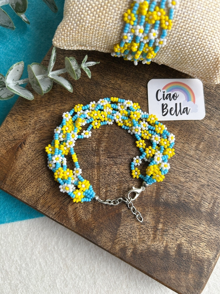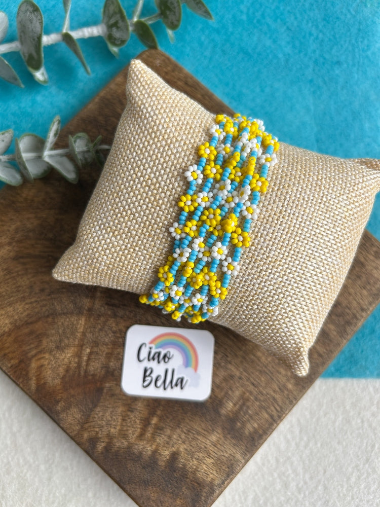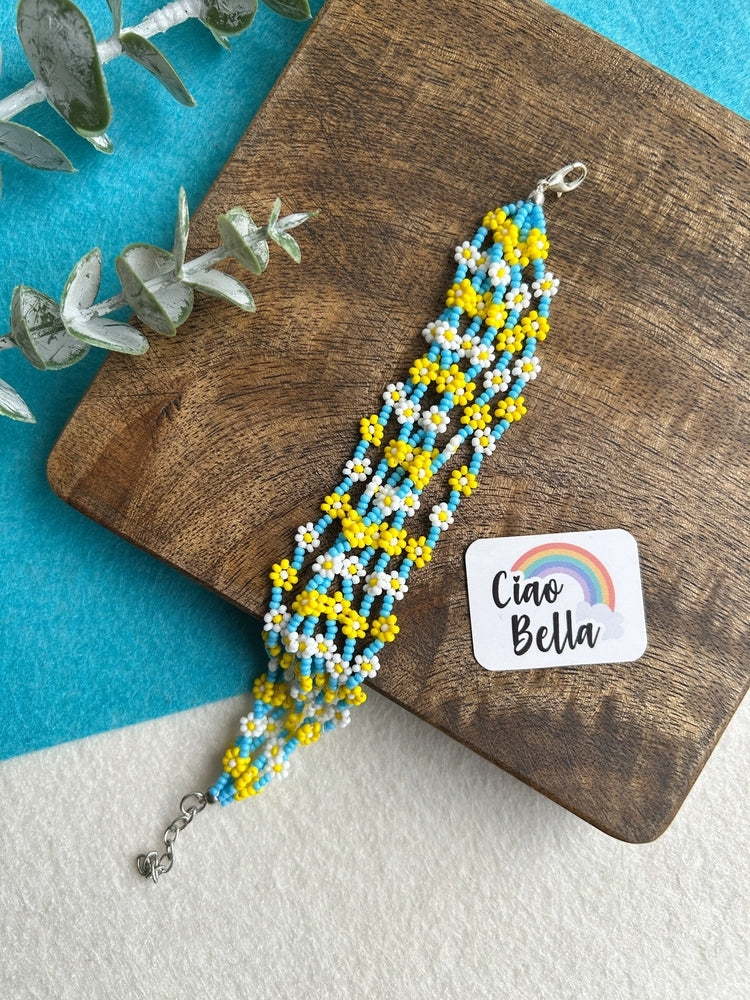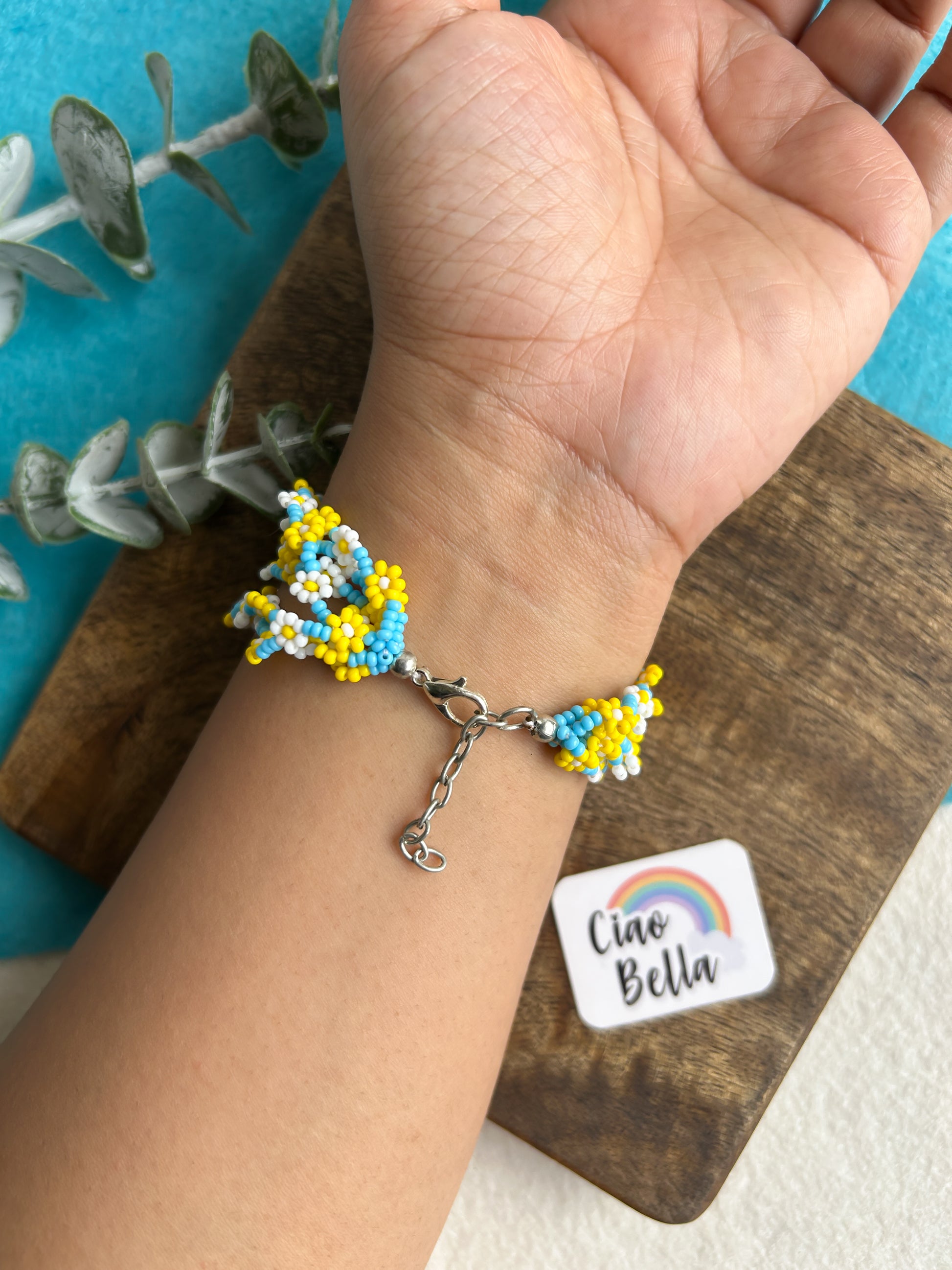 Spring Bloom Blue Yellow White Daisy Handmade Beaded Bracelet