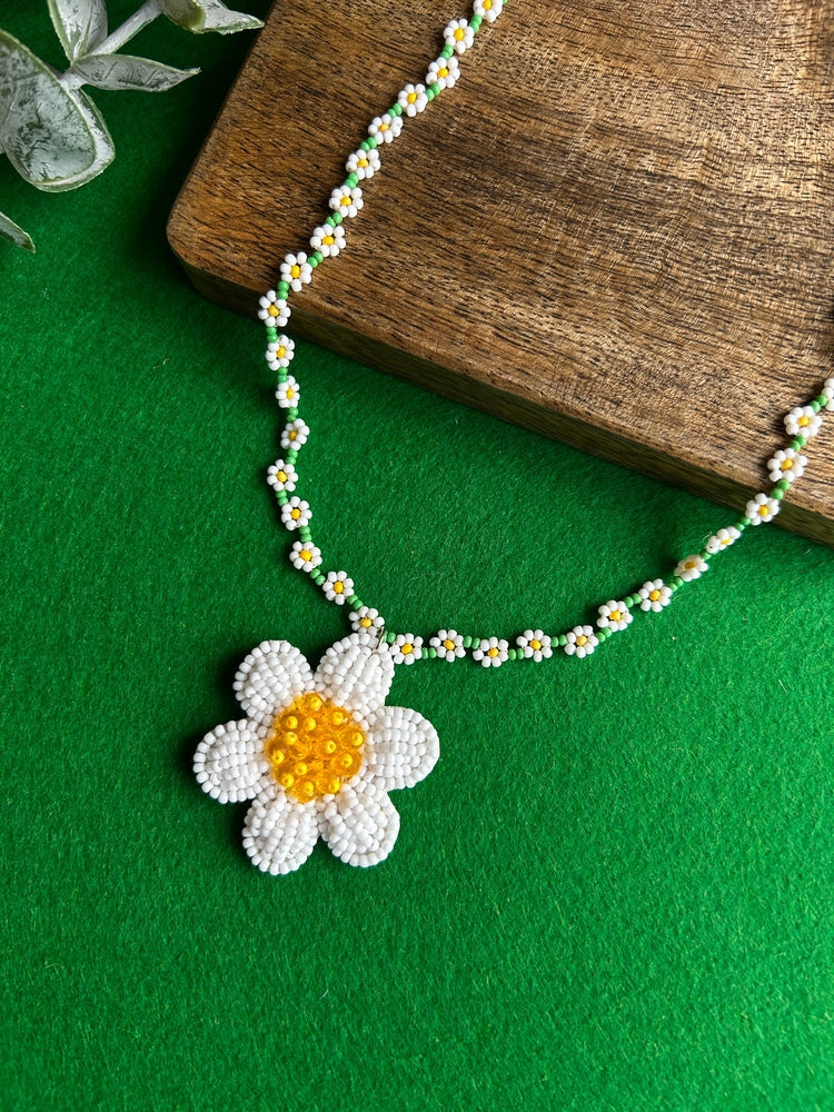 Spring Bloom Green White Daisy Handmade Beaded Necklace