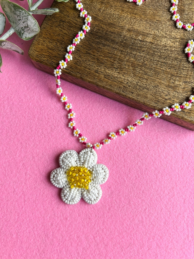 Spring Bloom Pink White Daisy Handmade Beaded Necklace