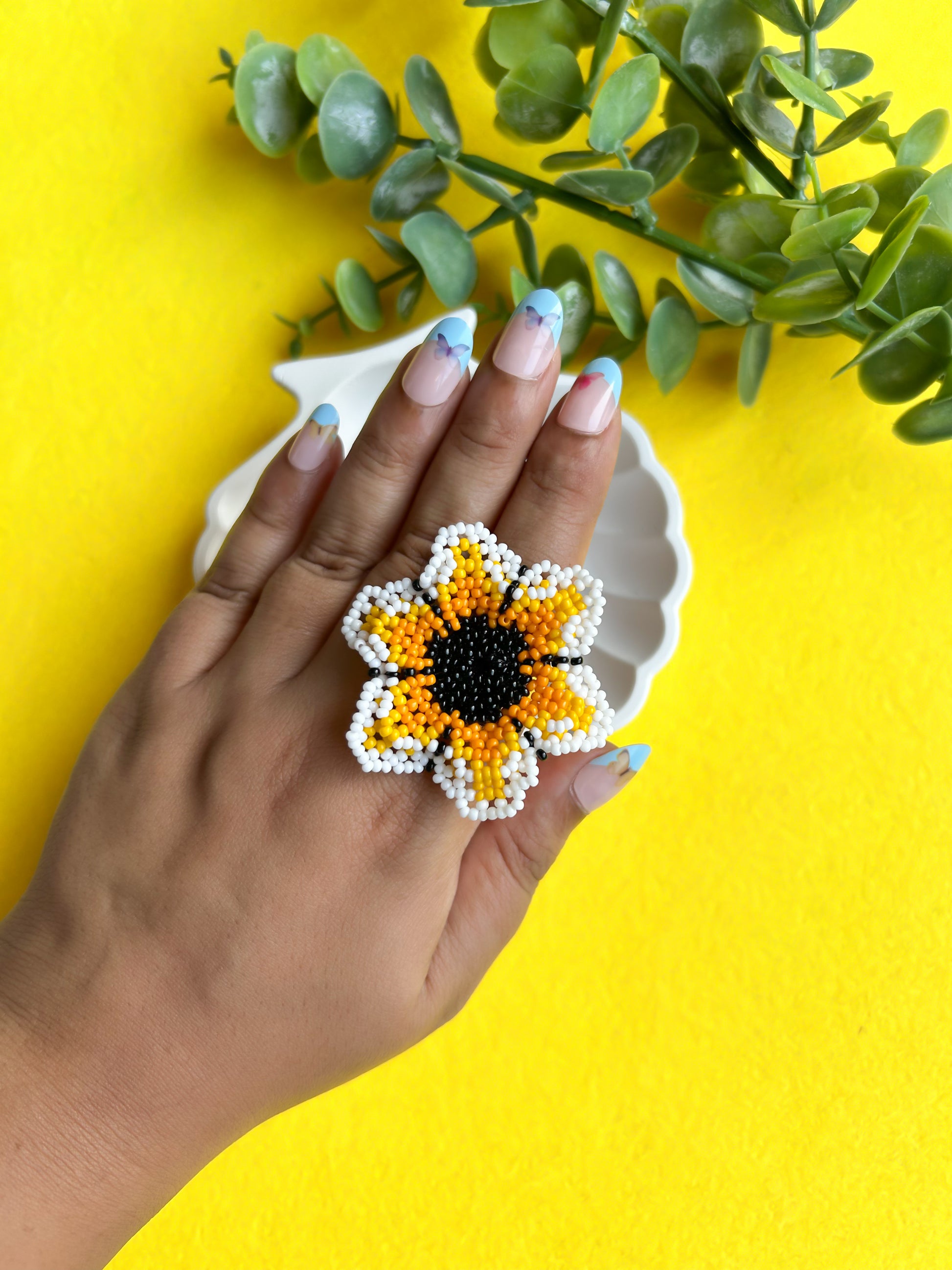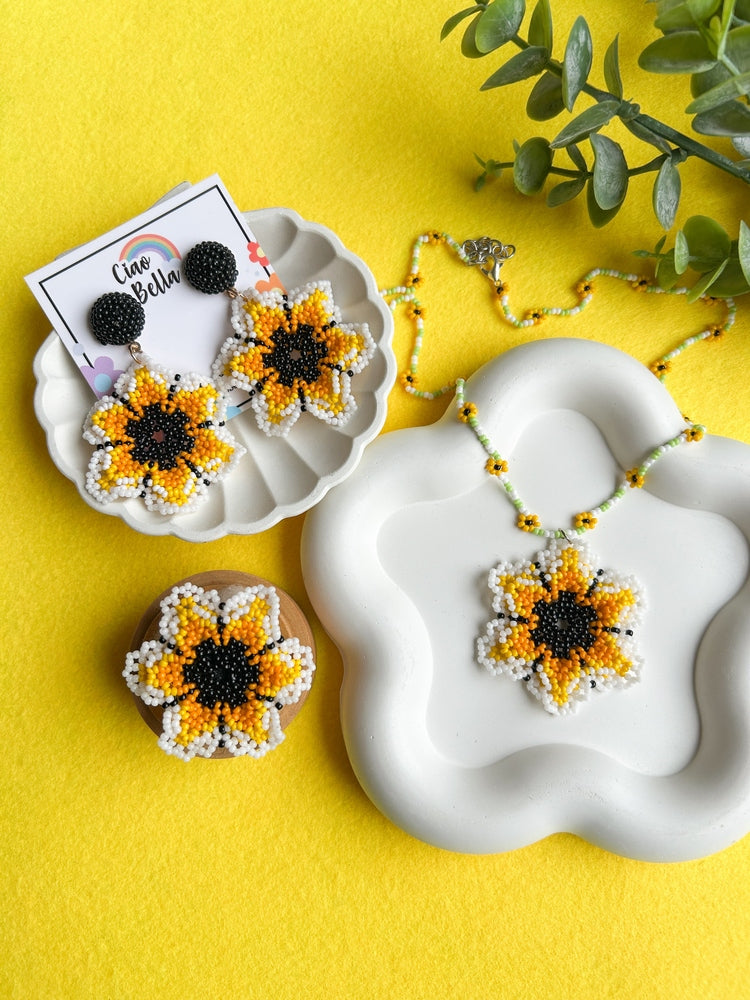 Sun-Kissed Flower Handmade Beaded Necklace + Earrings + Ring Set