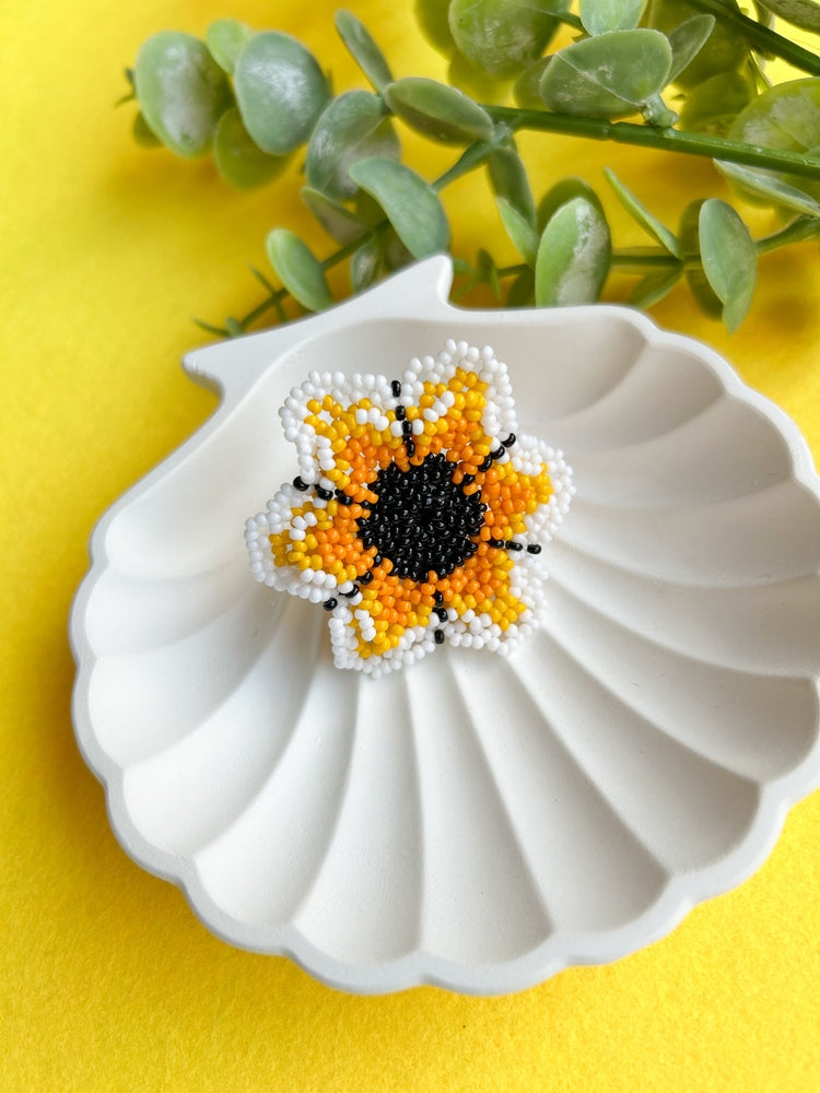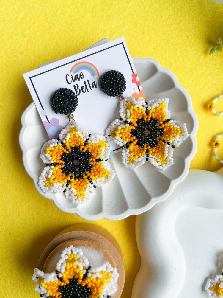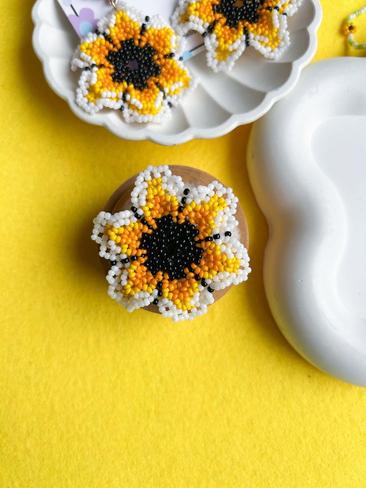 Turn up the flower power with these playful Sun-Kissed Flower Handmade Beaded Necklace + Earrings + Ring Set. Delicate white, yellow, and black beads create charming sunflower designs for a fun and quirky addition to any outfit. Bring a touch of sunshine to your jewelry collection (and your day)!